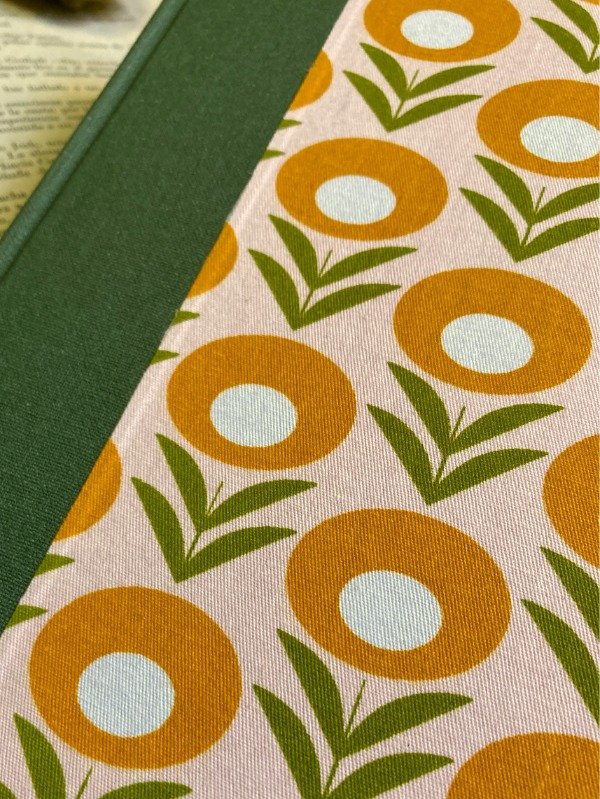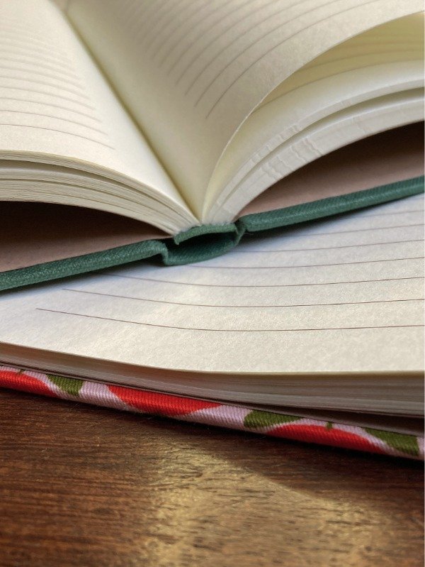 Podés elegir hojas lisas, si preferís un espacio abierto para bocetar o explorar sin límites, o hojas rayadas si te gusta escribir con una guía que sostenga el trazo. Las tapas están cubiertas en telas de algodón estampadas combinadas con tela de encuadernación, y las guardas son de papel Royal Sundance de 120 g, un material firme y agradable al tacto.