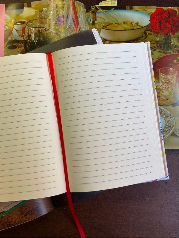 Cuaderno A5 (15 x 21 cm aprox.), 80 hojas color crema rayadas, lomo redondeado, tapas duras forradas en telas de algodón.