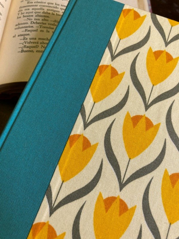 Cuaderno A5 (15 × 21 cm aprox.) · 80 hojas color ahuesado (bookcel) lisas o rayadas · Lomo redondeado · Apertura 180° · Tapas duras forradas en telas de algodón.